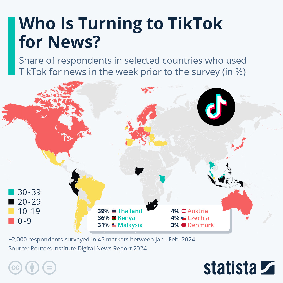 2. According to its data, some people in countries such as Thailand (39 percent), Kenya (36 percent), Malaysia (31 percent), Indonesia (29 percent), South Africa (28 percent), Peru (27 percent), Philippines (23 percent) use TikTok for news.